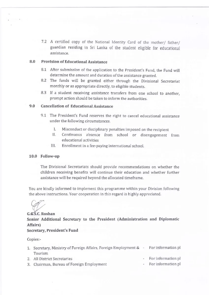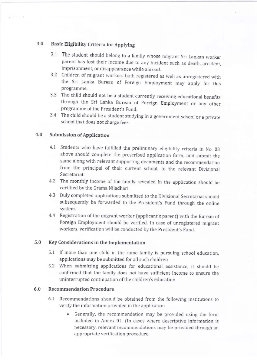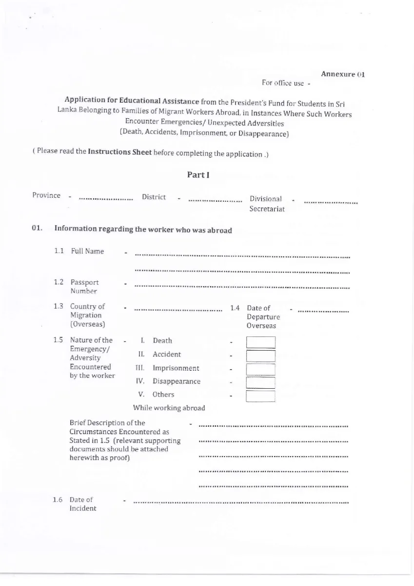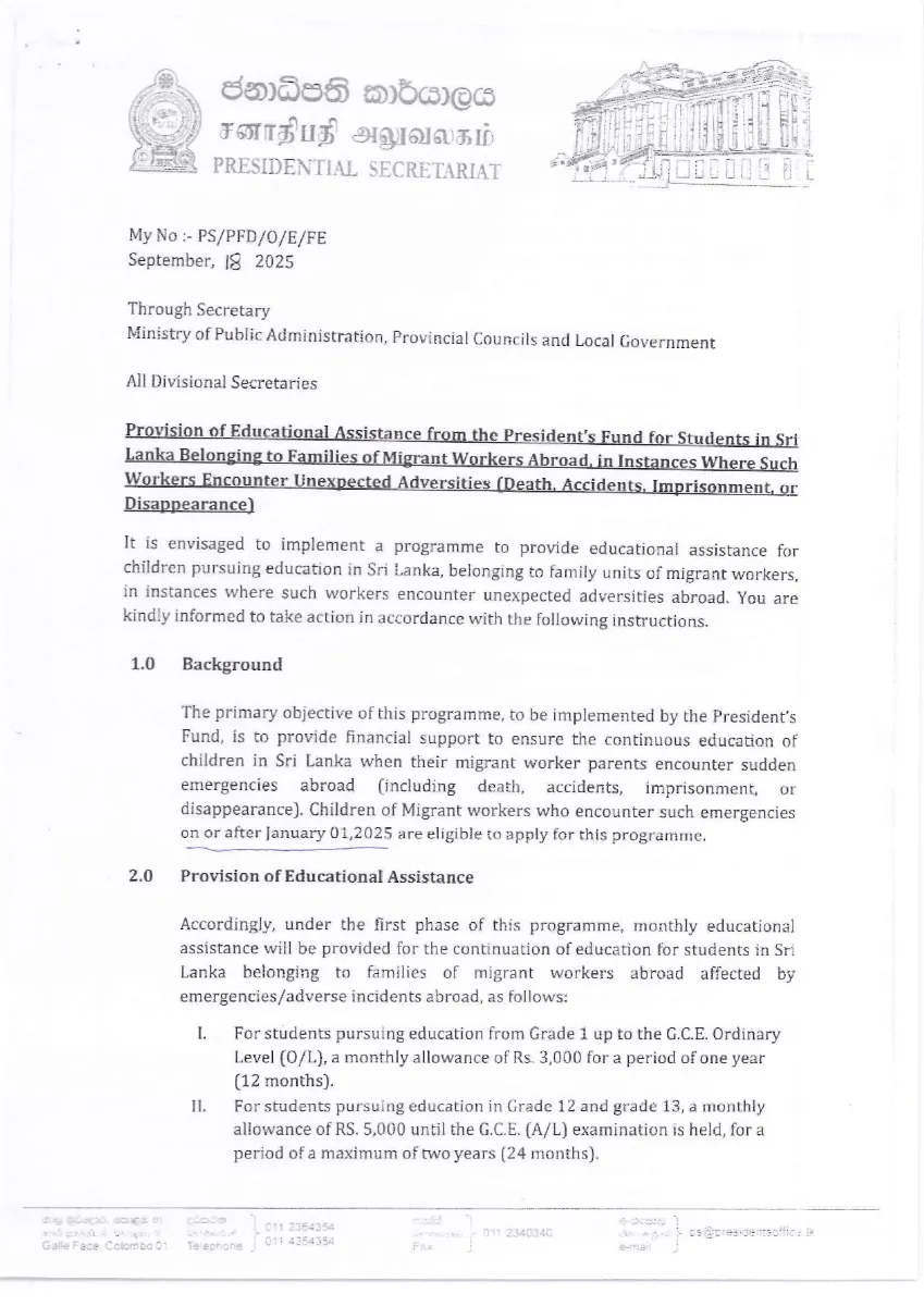 Provision of Educational Assistance from the President’s Fund for students in Sri Lanka Belonging to Families of Migrant Abroad, in Instances Where such Workers Encounter Unexpected Adversities (Death, Accidents, Imprisonment or Disappearance)