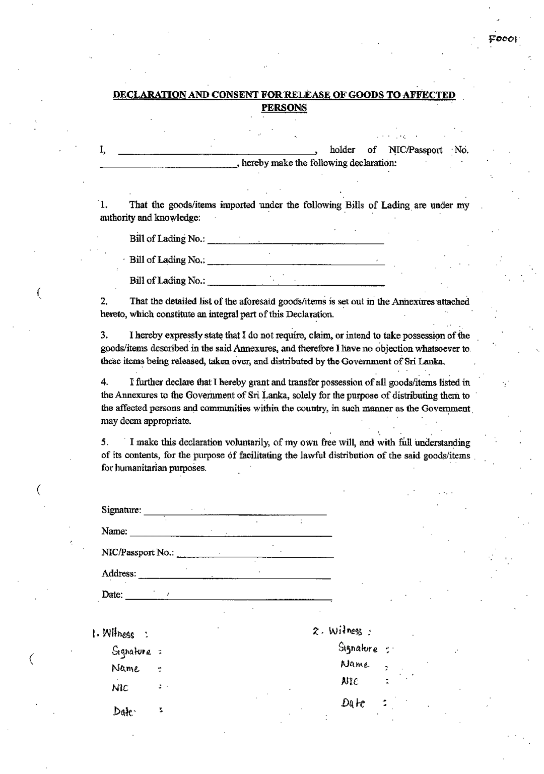 Attached herewith is a Declaration and Consent Form forwarded by the Disaster Management Center (DMC) of Sri Lanka which shippers of Private Consignments from abroad are required to sign prior to sending consignments.