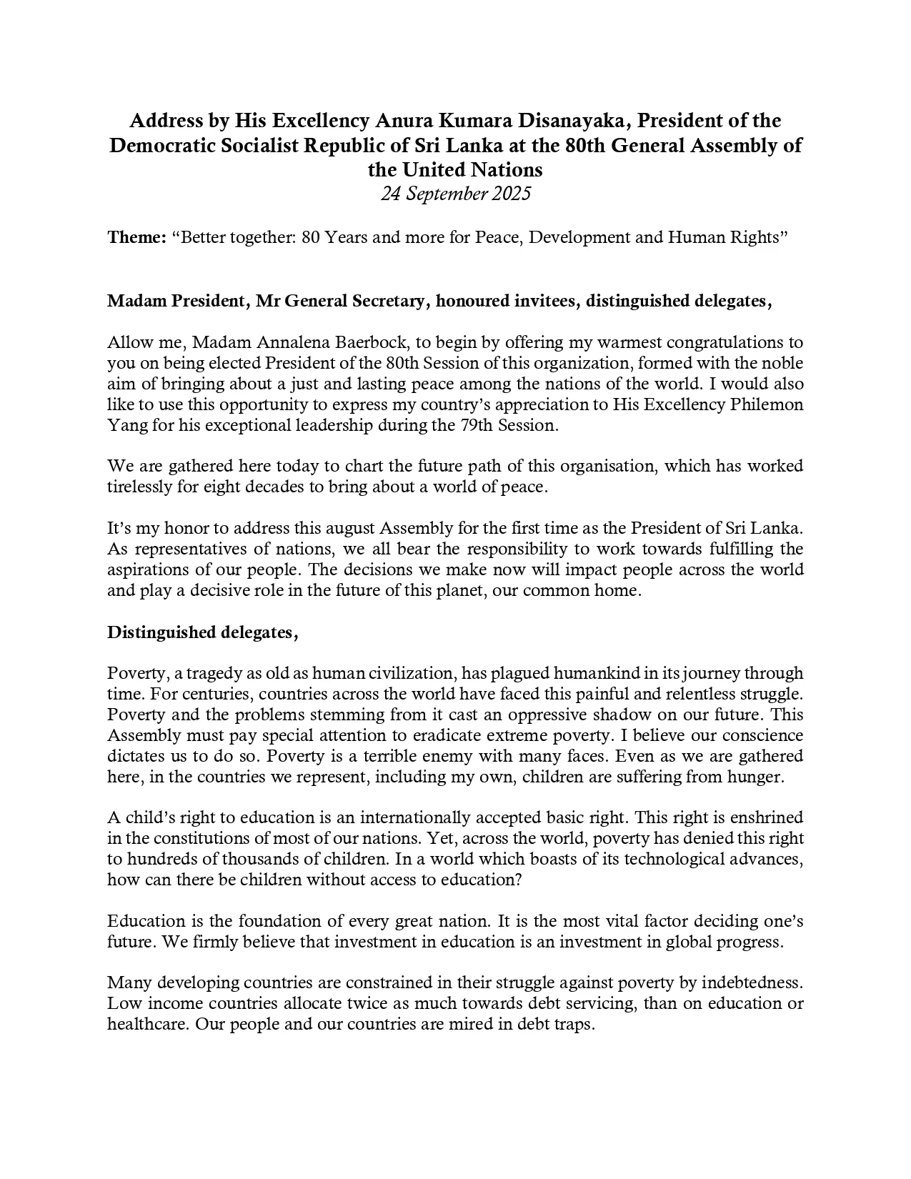 Dissemination of National Statement Delivered at the 80th UN General Assembly